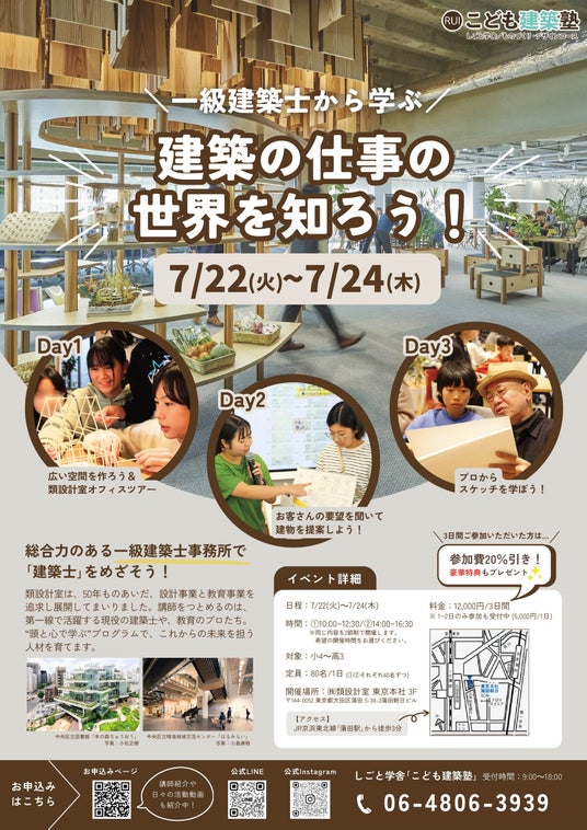 株式会社類設計室(東京本社:東京都大田区蒲田5-38-3 代表取締役社長:阿部紘)は、7月22日、23日、24日の3日間、小4~高3を対象に「こども建築塾」を東京本社3Fで開催します。第一線で活躍する一級建築士や教育のプロ講師から、建築設計ものづくりを直接学んでいただける講座です。3日間ご参加で参加費20%オフと豪華特典を差し上げます。(各日1.10時~12時30分、2.14時~16時30分の2つの時間帯があり。1.2.とも同じ内容です)。