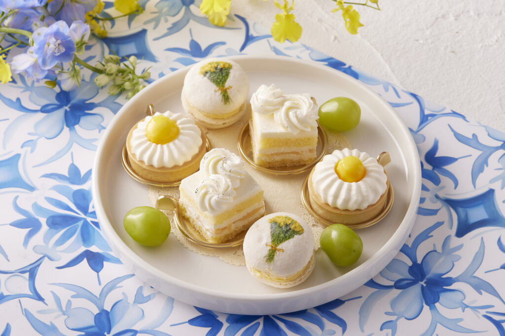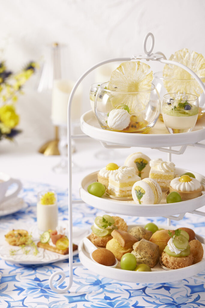 白い薔薇やカスミソウなど、繊細な花々をモチーフにしたスイーツが、エレガントに3段スタンドを彩ります。みずみずしいシャインマスカットをふんだんに使用したシュークリームやスコーン、メロンや洋梨を使った香り高いデザートまで。季節感と華やかさを閉じ込めた、ファッションのように楽しむアフタヌーンティーです。