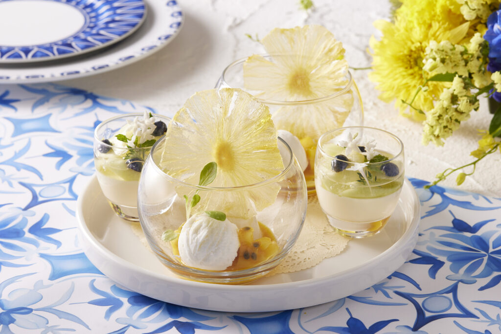 「向日葵をイメージしたパイナップル、マンゴー、ココナッツのピニャコラーダ仕立て ~ヨーグルトソルベを添えて~」「メロンのパンナコッタ カスミソウ仕立て」
