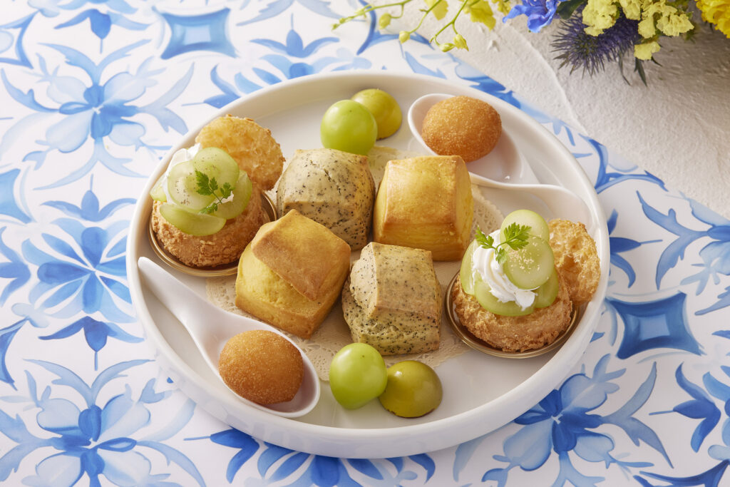 【下段】シャインマスカットのシュークリームと紅茶香るスコーン、ライムグリーンのチョコレートやイタリアンフリット。甘さと塩気が心地よく交差する、遊び心あるひと皿。