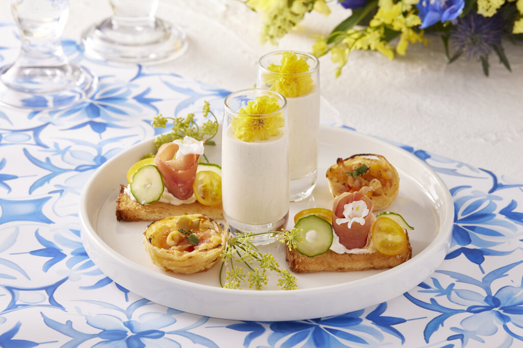 【セイボリー】彩り野菜と生ハムの菜園仕立てに、花を浮かべたヴィシソワーズが香り立つ。トリュフが重なる、贅沢な塩味のアンサンブル