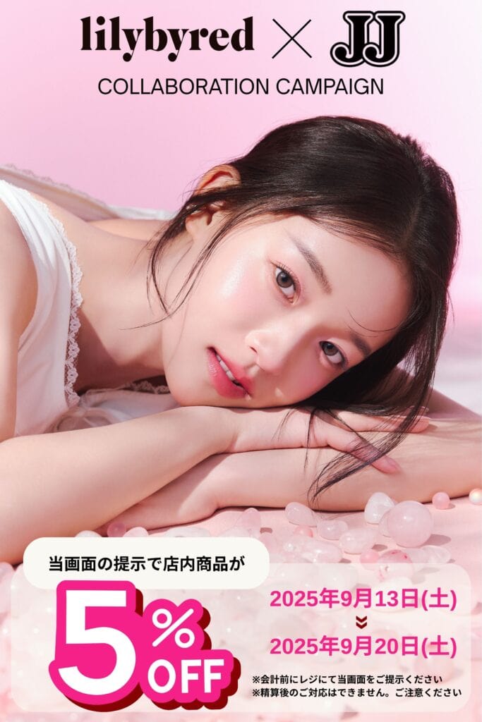 JJ公式Xをフォローし、9月13日(土)投稿予定のlilybyredコラボ投稿をリポストすると、抽選で5名様にlilybyredコスメ豪華詰め合わせセット(5,000円相当)をプレゼント