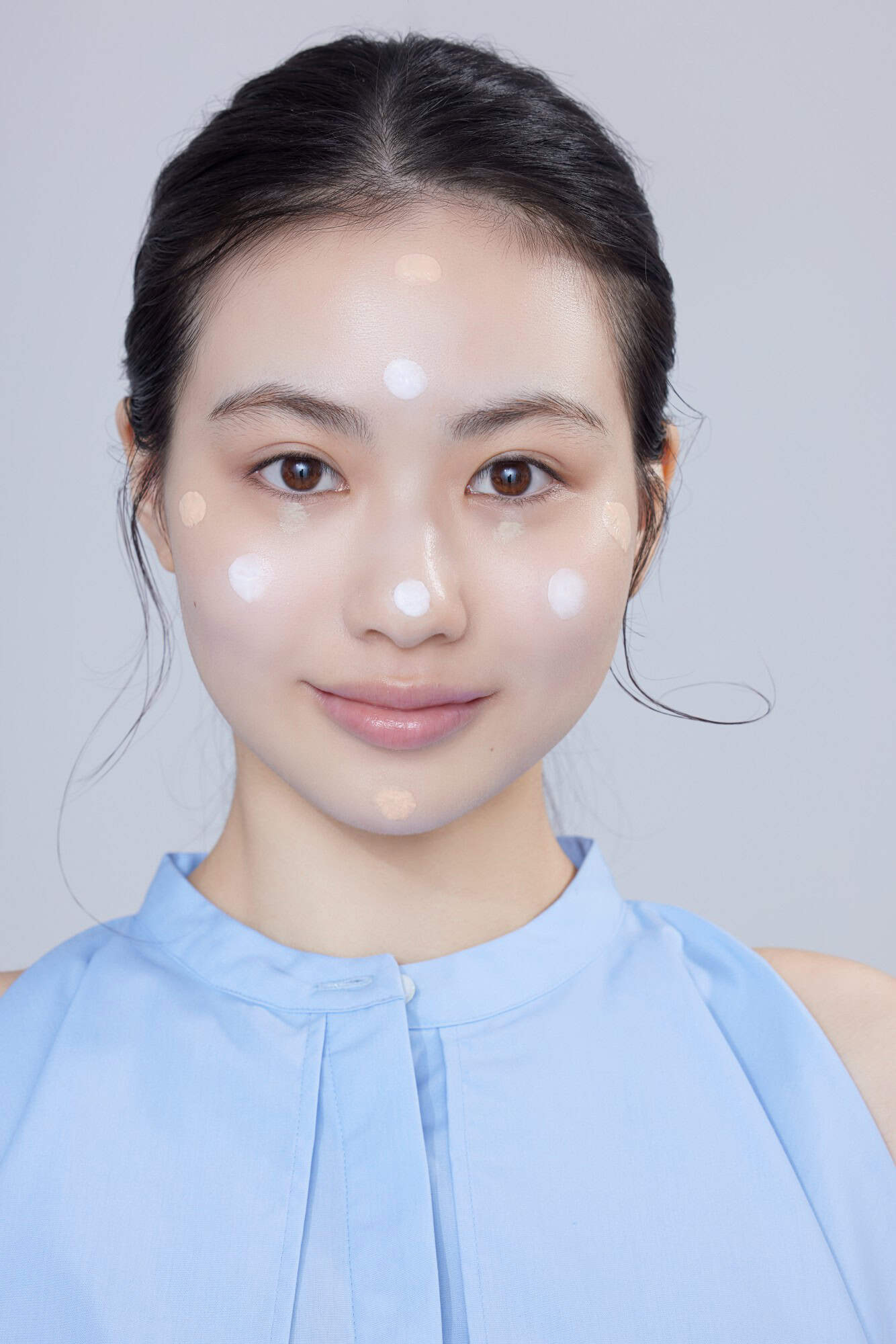 額、頬骨の左右高い位置、顎先にバナナ コンシールアイクリームを、眉間、鼻先、頬骨の中央高い位置にバナナ スポットカーミングクリーム 02、目の下にバナナ スポットカーミングクリーム 01を少量オン。肌になじませます。パウダーでおさえれば、ファンデーションいらずのヘルシーで透明感のある、つや肌が完成!