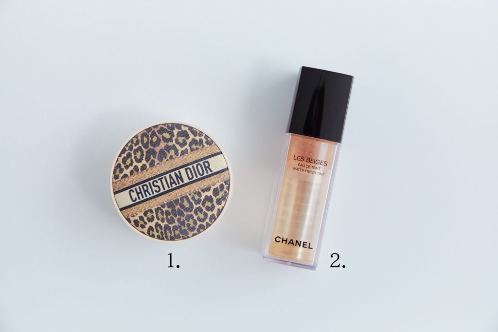 まず、手持ちのサンクリームを肌全体に薄く伸ばしてからスタート。次に、ファンデーション「シャネル レ ベージュ オー ドゥ タン ライト」を顔全体になじませます。75%美容成分が入ったジェルにベージュの粒が浮いている、少し変わったファンデーションなんです! ジェルとファンデを混ぜて伸ばすと、色ムラや毛穴を自然に補正できるのに、素肌っぽい仕上がりが叶うところが気に入っています。クマやニキビが気になるときだけ手持ちのコンシーラーでカバー。ベタつきが気になる部分には、「ディオールスキン フォーエヴァー クッション パウダー」でふんわり押さえます。水系成分が25%入ったルースパウダーで繊細なパール感があるので、肌表面はサラッと、でもフレッシュな印象のあるツヤ肌に仕上がります。