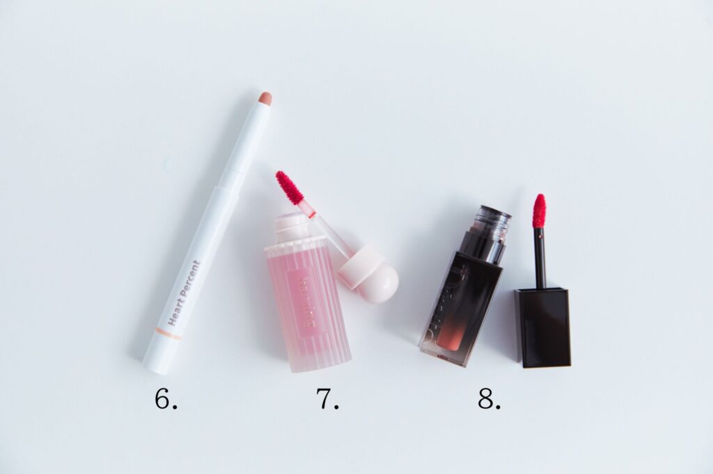 リップにボリューム感を出したいときは、みずみずしい光沢感のある「Dinto ブラーグローイリップティント 211」。唇の中央からジュワッとにじんだようなマットリップに仕上げたいときは、「Haming Soft Blushed Tint 02」を使います。今日は全体にDintoを塗ってボリューム感を出してからリップ中央にHamingで色味を重ねて、グラデーションリップにしてみました!