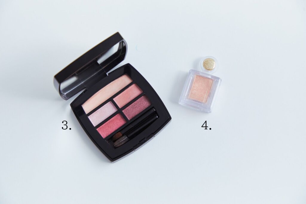 次はアイメーク。普段はあまりアイシャドウを濃く塗りません。「シャネル レ ベージュ パレット ルガール クール ドゥ シャネル」の一番上のベースカラーでアイホールの色ムラを整える程度。華やかな印象をプラスしたいときは、繊細なオレンジのキラキラが可愛い「マジョリカ マジョルカ シャドーカスタマイズ BE286」を涙袋にしっかり塗って、ウルッとした立体感をつけます。