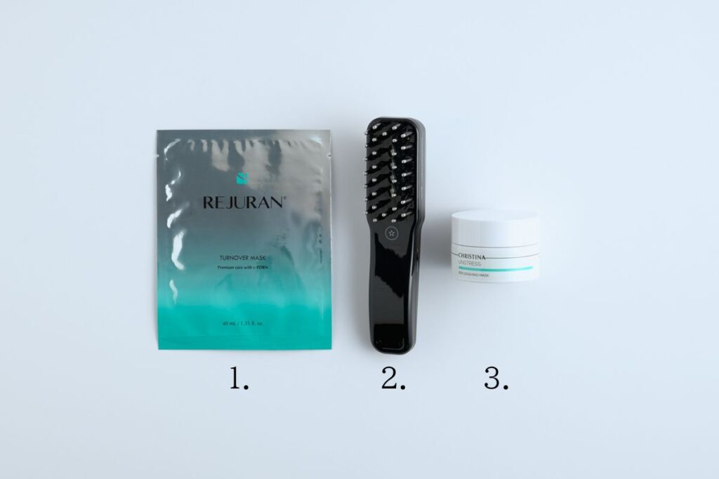 3つ紹介したいのですが、まずはお風呂上がりの濡れた髪に「G.Mコーポレーション ELECTRON LAB デンキバリブラシ®(廃盤)」を使って頭皮をマッサージします。頭皮が凝るとフェイスラインも下がってきちゃうので、これで全体的に上げます。フェイスパックしている間に使うのがいつものお決まりです。