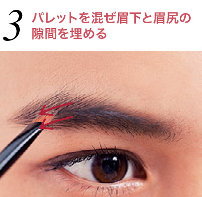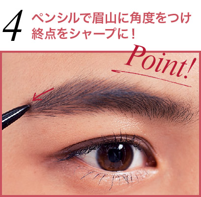 眉下は自己処理ですっきり整っている夏目さんの眉。眉上は、眉山〜眉尻を整え、眉の終点をシャープに締めることがポイントに。