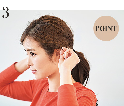毛束にボリュームがあると見違えるほどこなれて見える一つ結び。結ぶ時も、必ず巻いています。
