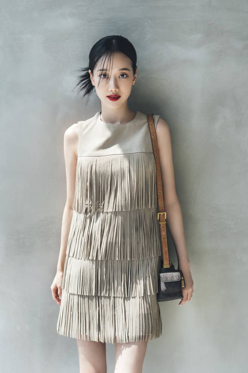ボーホーファッションの特徴であるフリンジをあしらったミニマルなワンピースを主役に全体のトーンを統一することで自然体なムードを作り、ナチュラルで軽やかなボヘミアンスタイルに。