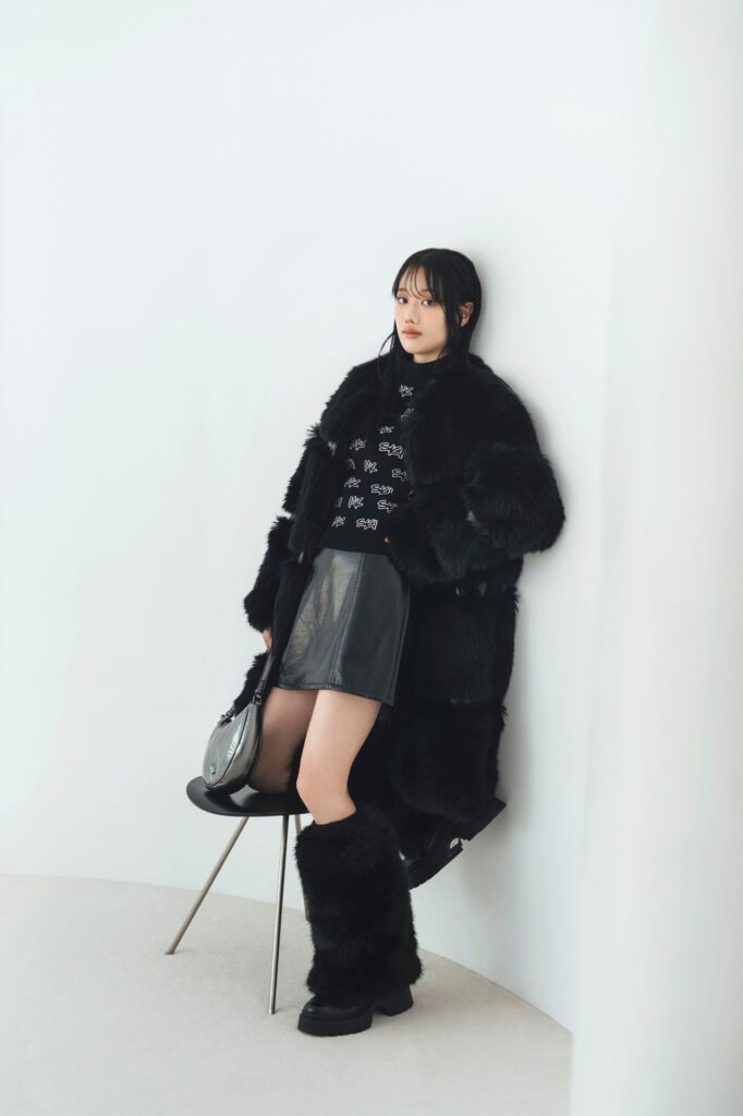 [スタイリスト阿部さんのポイント解説]ボリューム感のあるファーコート&レッグウォーマーでガツンとメリハリを効かせたシルエットが主役! エコファーのほか、レザーミニやロゴニットなどY2Kっぽいエッセンスを散りばめたぶん、小物まで潔くALLブラックでまとめれば、大人っぽくモードな印象に昇華!