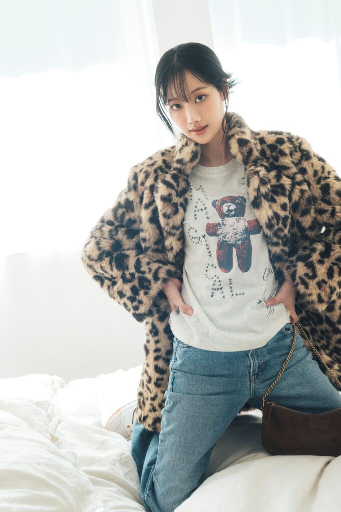 [スタイリスト阿部さんのポイント解説]ふんわり軽やかなフェイクファーコートは、100%リサイクルポリエステル仕立てで、着る人にも地球にもやさしい❤ ベーシックなレオパード柄はどんなコーデにも寄り添ってくれるけれど、今季ならTシャツ×デニムに合わせて平成っぽく楽しむくらいがいい感じ!