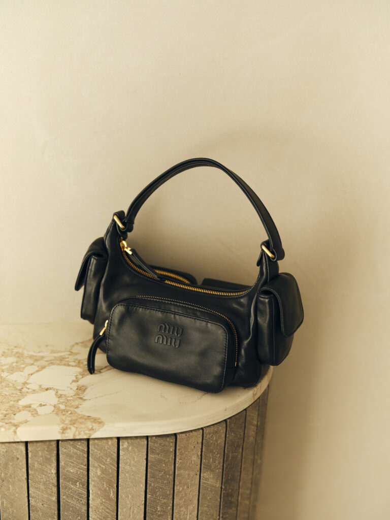 上質なナッパレザーを贅沢に用いた、ミュウミュウのショルダーバッグ。立体的に構築されたポケットがデザインアクセントとなり、シンプルなフォルムに表情を与える。肩にかけるとラインが美しく際立ち、スタイル全体を一段と洗練された印象へと引き上げてくれます。