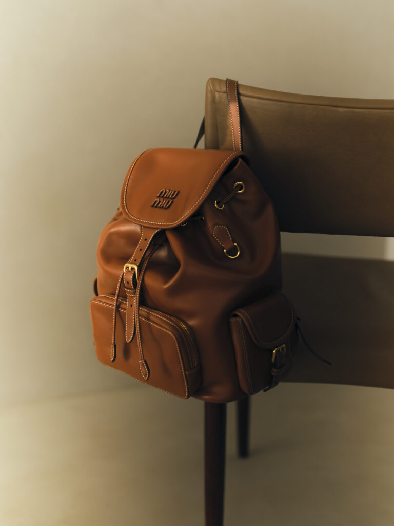 上質なレザーの艶が美しく、背負うだけで女性らしいしなやかさが宿るバックパック。流れるようなフォルムの美しさは、まさにミュウミュウならでは。機能性とデザイン性を兼ね備え、ファッションアイテムとして持つ喜びに満たされる逸品。