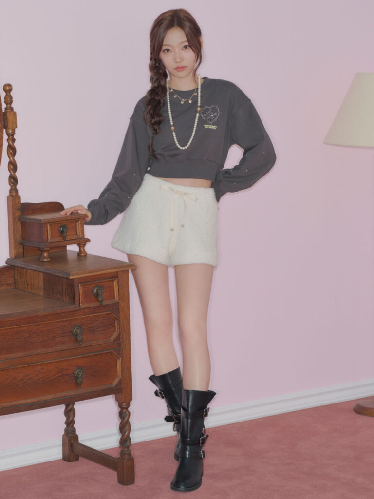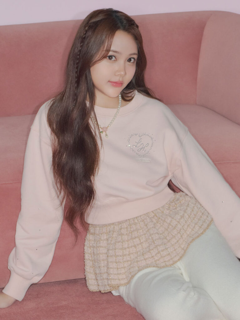 0サイズはコンパクトなクロップド丈で、左胸にそれぞれの頭文字”L”と”H”を組み合わせたオリジナルロゴがビジューで形作られています。また、袖にもビジューが飾られていて、いっそう華やかな印象に。