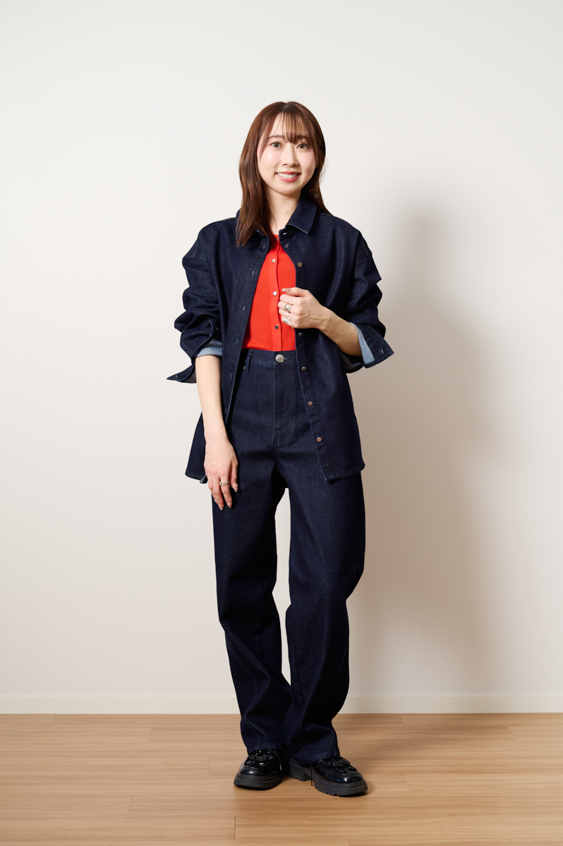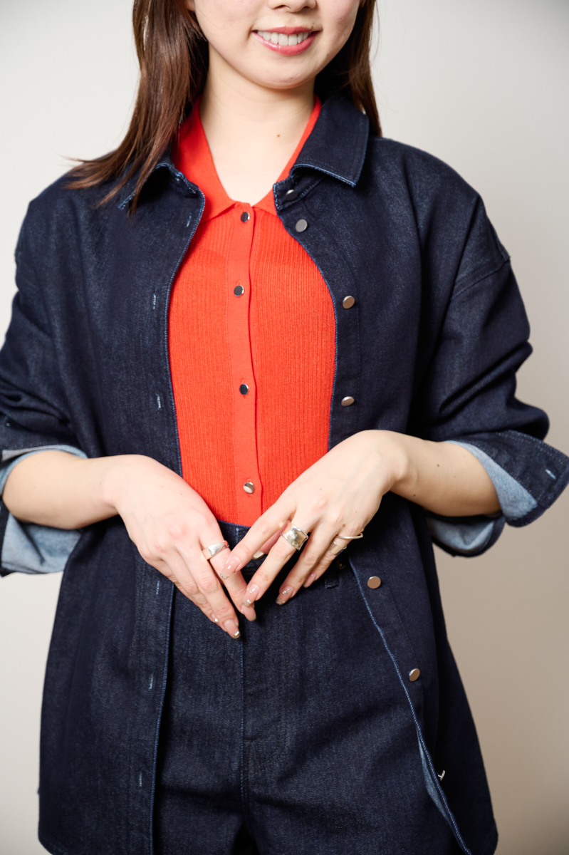 「今季トレンドになっているデニムonデニムコーデは、色のコントラストを効かせるのがポイント。深みのあるインディゴデニムに、赤でも朱色でもない絶妙な色味のトマトレッドを合わせました。少しやわらかく明るいトーンの赤がアクセントになっていて、シンプルなのにおしゃれに見えるのが魅力です。この絶妙なカラーの組み合わせが、PLSTらしい大人の日常着の雰囲気を引き立ててくれるのもポイント。さりげなく印象的なスタイリングに仕上がります。さらに、デニムの裏地をあえて見せているのもこだわりのひとつ。重たく見えがちなデニムコーデにやわらかいトーンを加えることで、軽やかな印象にまとめました」(身長163㎝/Mサイズ着用)