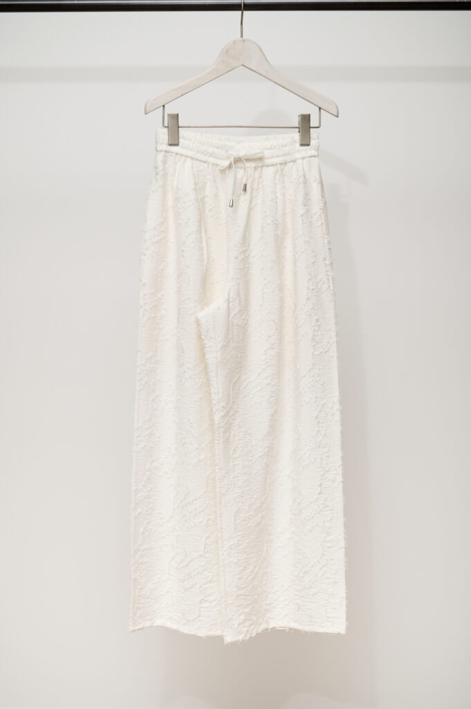 【新作のポイント】カジュアルなムードの中に、さりげない華やかさを添えてくれるジャカードパンツ。すっきりとしたストレートシルエットはトップスを選ばず、着回し力も抜群。ウエストはゴム仕様に加え、調整可能なドローストリング(引っ張って絞る紐)付き。ストレスフリーなはき心地なのでデイリーに頼れる1本です。縫い目に沿ったポケット付きで実用性も◎。ショート丈の裏地が付いているので安心感もあり、裾に向かうとほどよく透けているので軽さも演出できます。これからの季節に映える透かしジャカード素材です。
