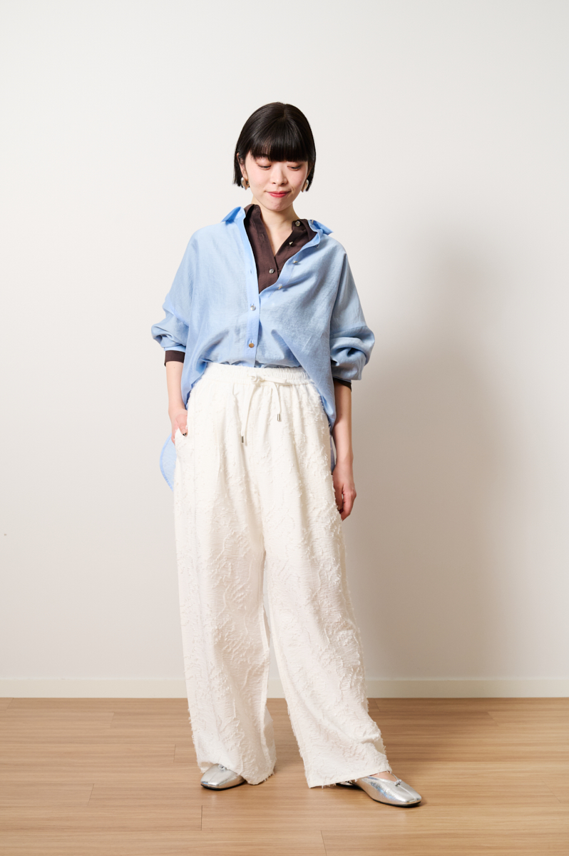 「カジュアルなジャカードパンツを主役にしたスタイリング。トップスもあえてラフなムードでまとめ、シルエットゆったりめのシャツを合わせました。今季注目のレイヤードスタイルを取り入れ、シアーシャツを2枚重ねに。軽やかな透け感が奥行きを生み、シンプルながらも表情のある着こなしに仕上がります。インナーにはあえて暗めのカラーをセレクトし、全体をキュッと引き締めメリハリのあるバランスに。さらに、上に重ねたシャツはボタンを掛け違いにして首元に動きを加えました。さりげないアレンジでバランスに変化を出します」(身長150㎝/XSサイズ着用)