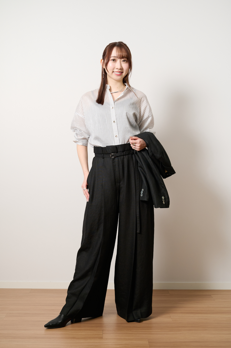 「シャツ×パンツのワンツーコーデ。ストライプ柄のシャツなので、何も考えずに着てしまうとシンプルなうえに真面目すぎる印象になりがち。ただでさえワンツーコーデが苦手なので(笑)、タックの入ったハイウエストパンツを合わせました。細めベルトがセットになっているためウエストにしっかりメリハリをプラスでき、腰位置を高く見せてくれるのでスタイルアップが自然と叶います。骨格ウェーブタイプは、トップスをコンパクトにまとめて重心を上に持ってくるのがバランス良く見せるコツ。シアーシャツをINしてほどよくブラウジングさせ、シンプルな着こなしにちょっとした技を加えています」(身長163㎝/Mサイズ着用)