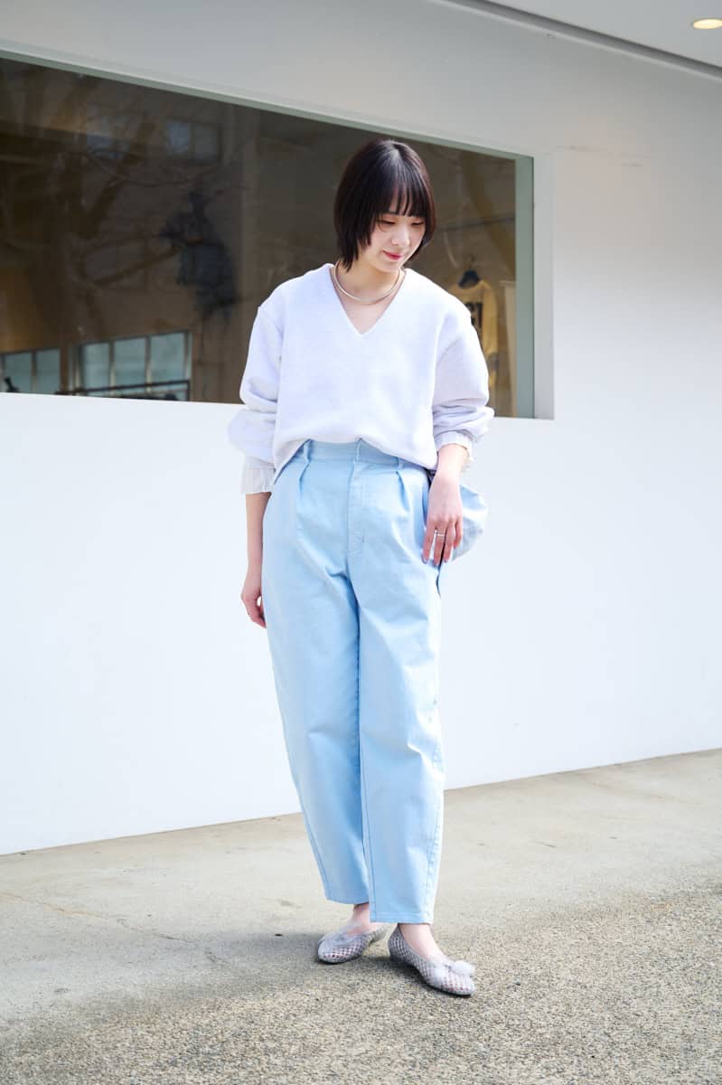 「Vネックのラインや袖口に施されているフリルのワンポイントレイヤードが、カジュアルになりがちなスウェットを上品に仕上げていて、カーヴィパンツとあわせても大人カジュアルな絶妙な着こなしに着地します。スウェットのフロントを軽くタックインして、 カーヴィパンツの丸みのあるライン を見せるときれい。少し暖かくなったら袖をまくって着るのもおすすめ。ふわっと広がった袖口が手首を細く見せてくれて、女性らしいラインを作ってくれます」(身長163㎝/⚪︎サイズ着用)