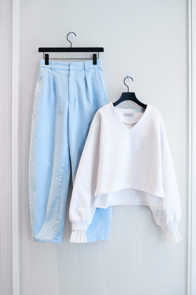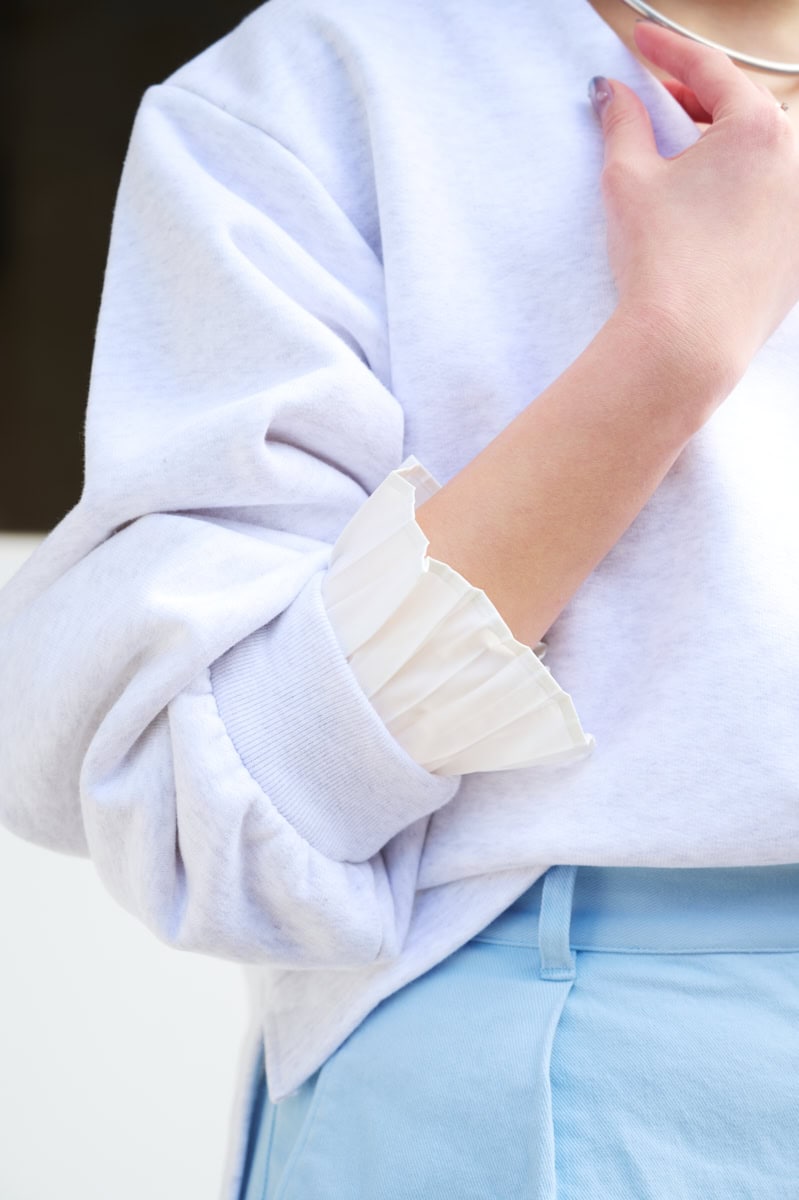 【新作のポイント】プリーツスリーブVネックスウェット¥29,700/Vネックや袖口のプリーツディティールが女性らしい印象を与えてくれるスウェットシャツ。袖口のプリーツをしまって着用することもできる2WAY仕様。丈に前後差があるデザインで、腰回りもすっきり見せてくれるアイテムです。