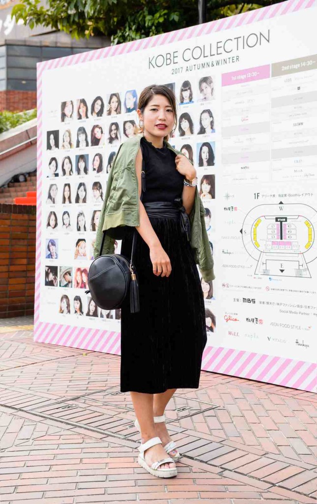 「9月になって買い足した、お気に入りのベロアスカートとニットのトップスを合わせて異素材MIXなオールブラックに。またサッシュベルトを巻いてスタイルUPも意識してみました。」