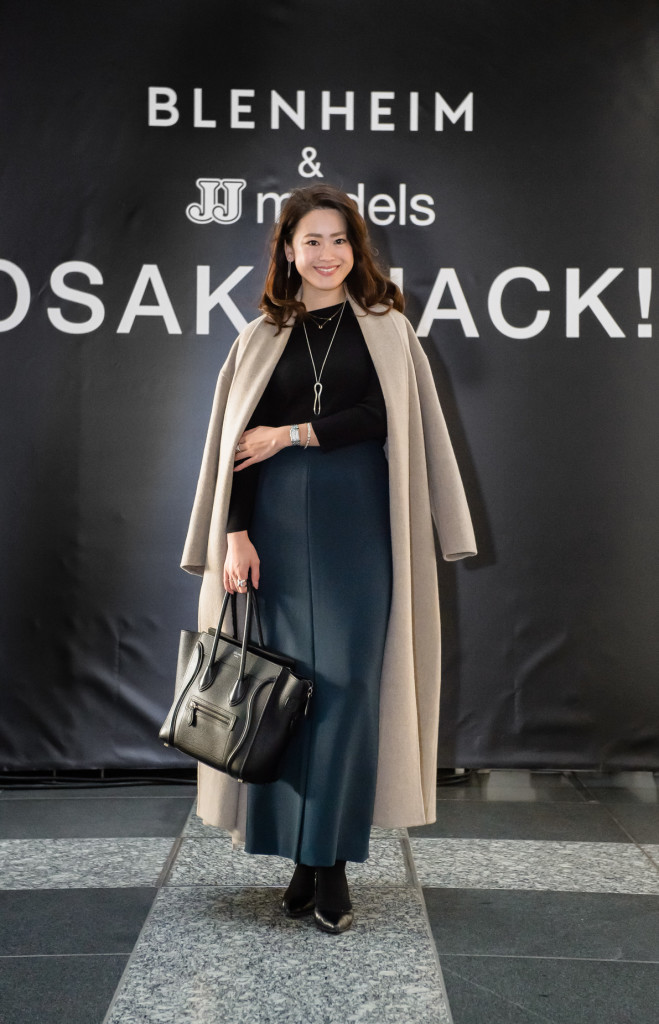 「深緑のロングタイトスカートはトップスにコンパクトなものを合わせてIラインを強調。コートの中をダークトーンでスッキリまとめたので、アウターは淡色のロングコーディガンをチョイスして優しげな雰囲気になるようにしました。」