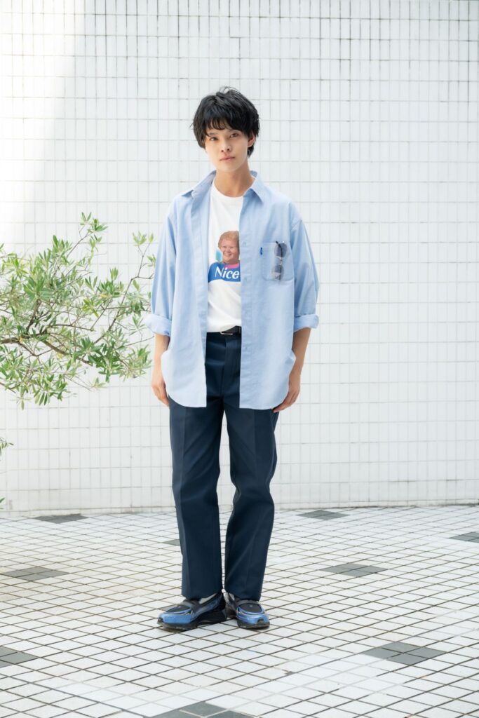 「ブルーのシャツは肌触りがよくて、着心地が◎ これからの季節に重宝するアイテムです。ワンポイントが効いたTシャツもお気に入り」NICE WEATHERのシャツ¥13,970 BALANSA for NICE WEATHERのTシャツ¥11,000 Dickies for NICE WEATHERのパンツ¥13,200(すべてNICE WEATHER 阪急うめだ本店)スニーカー¥19,800(New Balance/ニューバランスジャパンお客様相談室)サングラス¥41,800(One/Three Compound Frame/DJUAL Co., LTD.)