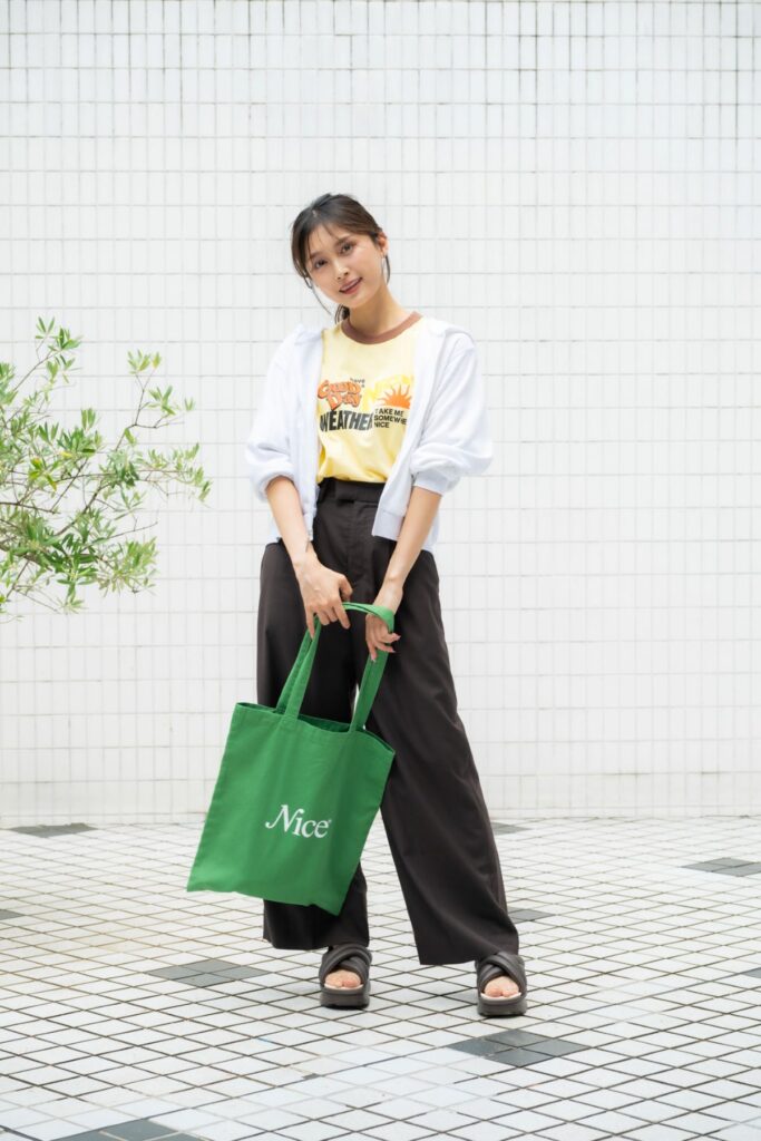 「黄色のTシャツとブラウンのパンツの色合いが好み♡ パンツのシルエットがだぼっとした感じもメンズライクで可愛いです」Tシャツ¥7,920パンツ¥11,880バッグ¥4,950(すべてNICE WEATHER/NICE WEATHER 阪急うめだ本店)パーカ¥9,900サンダル¥14,630(ともにNIKE SPORTSWEAR/ナイキ カスタマーサービス)