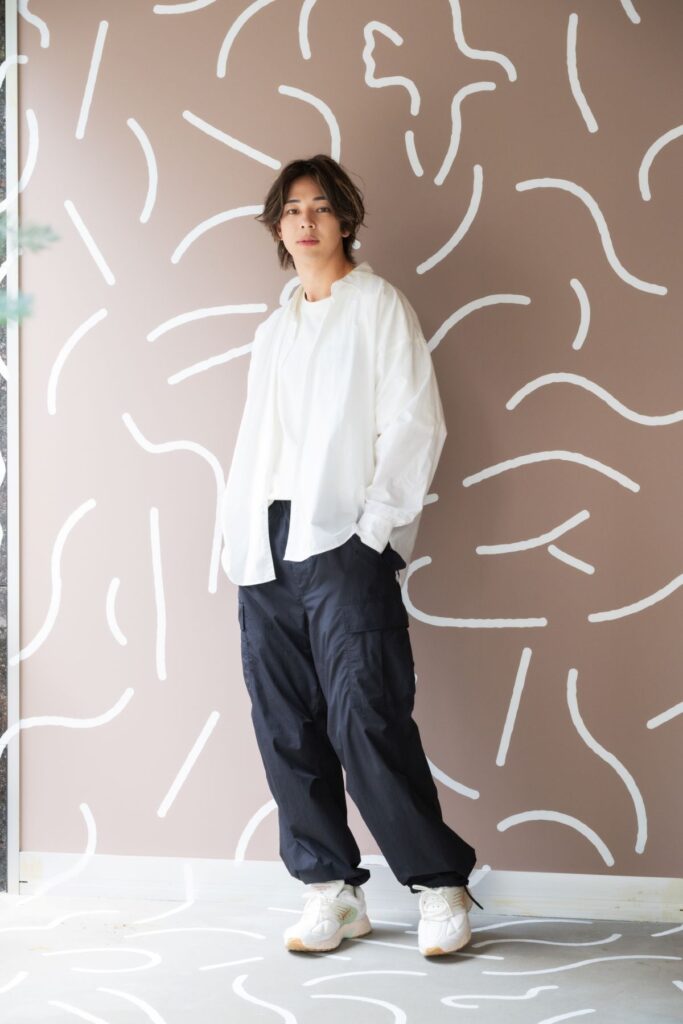 「カーゴパンツと白シャツの組み合わせが爽やか! ふたりで並ぶと『スポーティなカップルコーデ』って感じで楽しいです」パンツ¥12,980(Pants by NICE WEATHER/NICE WEATHER 阪急うめだ本店)スニーカー¥22,800(NIKE SPORTSWEAR/ナイキ カスタマーサービス)その他はスタイリスト私物