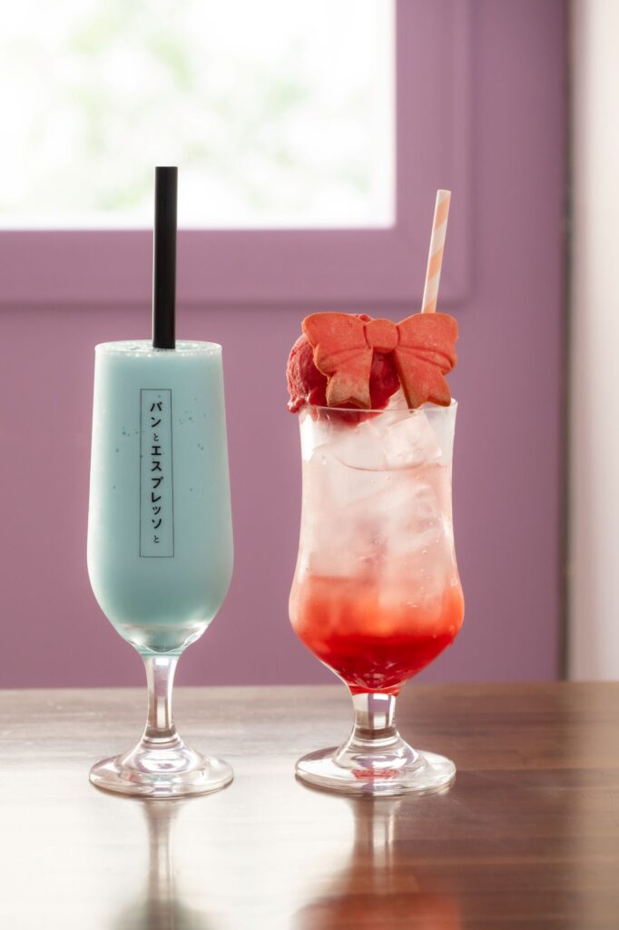<左>ジェラート・シェイク(ラムネ)¥900<右>リボンクリームソーダ(ルビー)¥1,100※色違いクッキーのオプション+¥100を含む