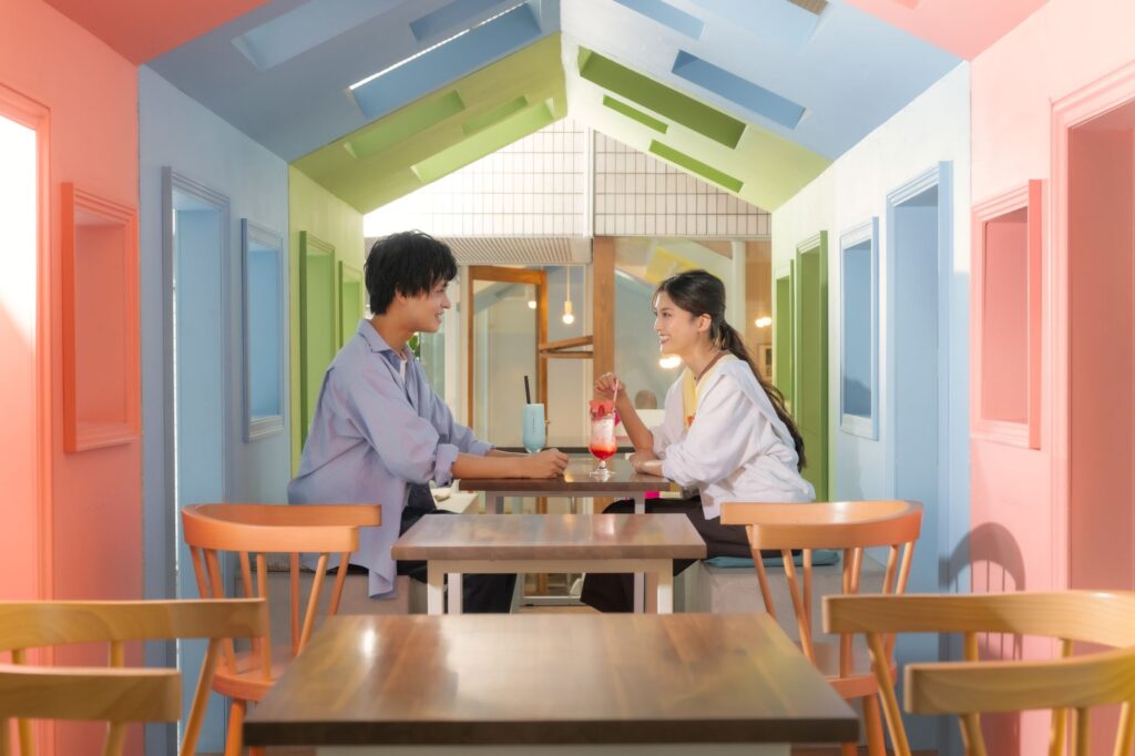 手作りジェラートのクオリティはもちろんのこと、「ジェラートとエスプレッソと」ではジェラートを味わう空間にもこだわりが満載。小屋のような作りのテラス席の入り口はちょっぴり小さめ。少し屈んで中に入ると、パステルカラーの空間が広がり、ファンタジーの世界に飛び込んだような気持ちになります。