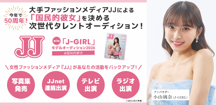 今回で3回目の開催となる「JJモデルオーディション」(株式会社光文社主催)は、「J-GIRL」=「国民的彼女」、「J-BOY」=「国民的彼氏」という時代を牽引するスターを発掘・育成するプロジェクトです。面接、カメラテスト、ライブ配信、WEB投票などから総合的に判断してグランプリ2名とJJ編集部賞2名を決定いたします。