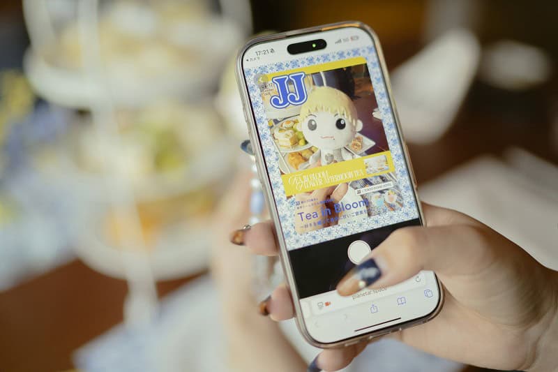 お席に置いてあるポストカードのQRコードをスマホで読み込むと、JJの表紙風のフレームが登場。推しグッズを撮影することで、まるでJJの表紙に推しが登場したかのような撮影が出来ちゃいます。QRコードは全部で3つ。それぞれのフレームもこのアフタヌーンティーのためにデザインされた特別なもの。ここでしかゲットできないフレームなので是非チェックしてくださいね。