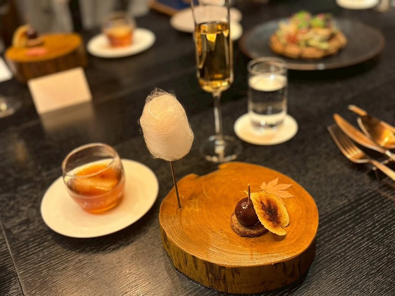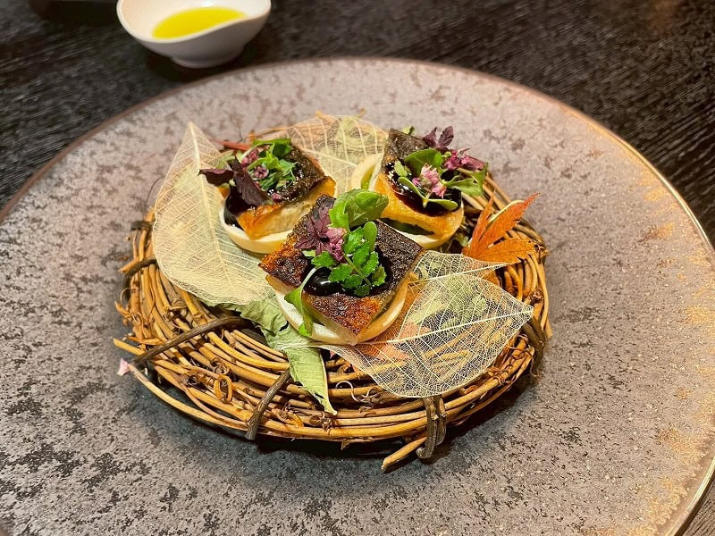 ビストロノミースタイルのフランス料理を提供するメズム東京のフレンチダイニング「シェフズ・シアター」で2026年2月28日(土)まで(※12月24日(水)・25日(木)を除く)開催中のダイニングプログラム、ディナー「森羅の宵 Nature’s Finale」は、敷居の高いイメージのフレンチを「リラックスして気楽に楽しんでもらいたい」と、キュリナリーマイスター (総料理長)隈元香己(くまもと・こうき)氏が「海山の恵み」をテーマに、国産食材を中心に構成し森の滋味と海の恵みを美しい演出とともに提供するコースメニュー。