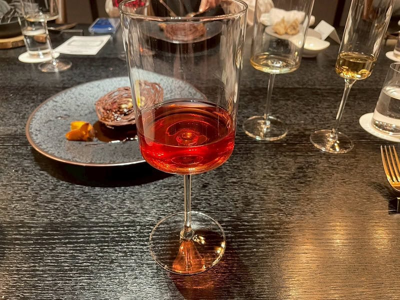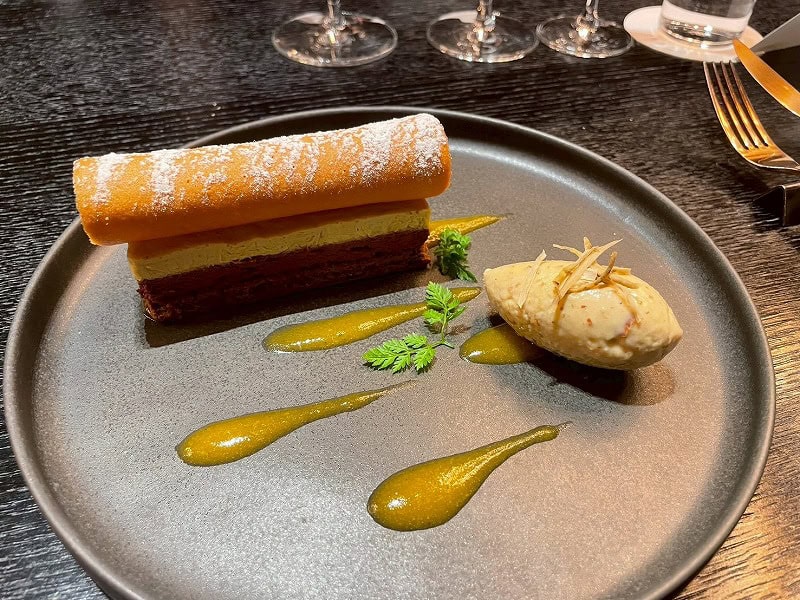 最後は「ごぼう」を使った珍しいデザートが登場。カシスと牛蒡(ごぼう)のムースにアプリコットソースの爽やかな酸味や根菜の甘みが凝縮されたジェラートが新鮮。粉糖にもごぼうが使われていて、大地の風味を感じるしめくくりとなりました。