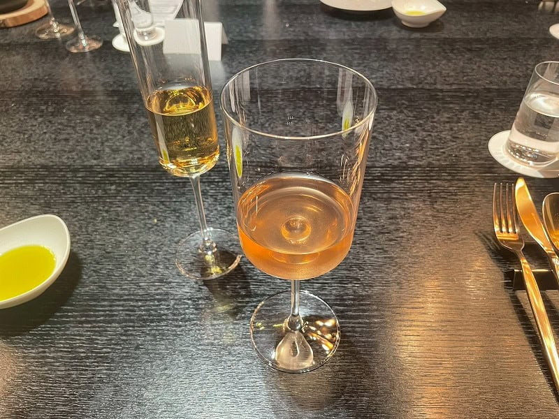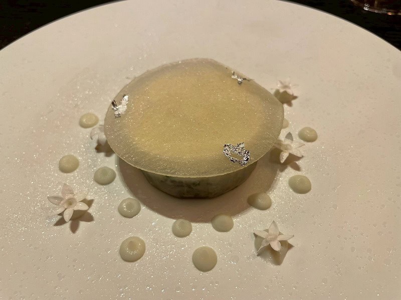 真っ白なお皿に乗せられた真っ白なオードブルは、なんとトマトを濾過してつくられたという透明のフローズントマトウォーターの下に、新鮮な車海老を用いたタルタルとなめらかなカリフラワーのブラマンジェを重ねたもの。しっかりとした旨味があるのにすっきりとした味わいでぺろりと進みます。