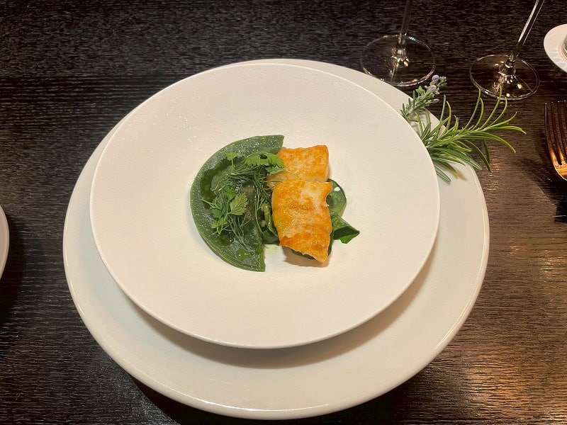 続いてメインの魚料理が登場。ローズマリーを重ねたお皿の隙間に水が入れられると、ハーブが香る湯気が出現。その音と、香りと、視覚的演出とともに味わう一皿は様々な感覚を刺激します。表面を香ばしくソテーした寒鮃にムール貝とアーモンドを包んだほうれん草生地のラビオリは海の恵みを感じる一皿。
