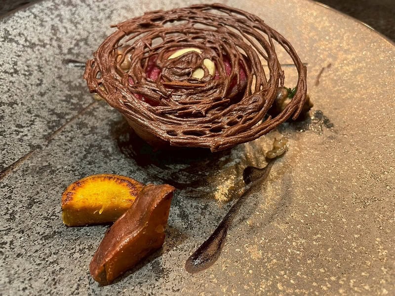 メインの肉料理は鹿肉のロースト。この種のジビエ料理には特に定評のある隈元氏が丁寧に下処理を施した蝦夷鹿を、外は香ばしく中はしっとりと最適な火入れでロースト。癖が無く最適な柔らかさで提供されるまさに技術が詰め込まれた一品。季節野菜が添えられており「フレンチのメイン料理には実際にその動物が食べるもの(今回は鹿)を添えることが多いんです」と隈元氏。そんな自然の循環が感じられる一皿。カカオのクロッカンを割って、食べることでカカオの程よい苦みがお肉のうまみを驚くほど引き立ててくれました。