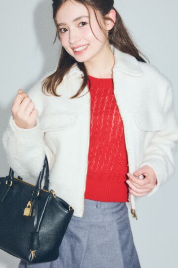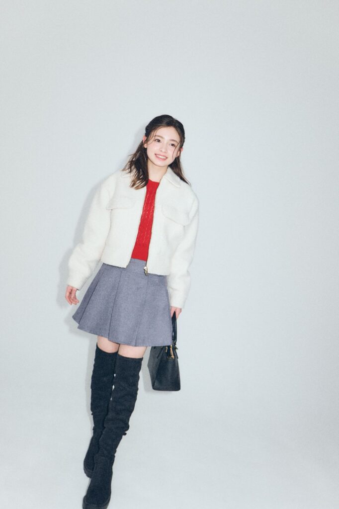 母と私が共通で好きな色が赤なんです。いっしょに外出する日は、赤のカラーリンクをするのが好き。赤いニットを主役に、プリーツスカートとロングブーツで上品に“優等生コーデ”を意識しました。
