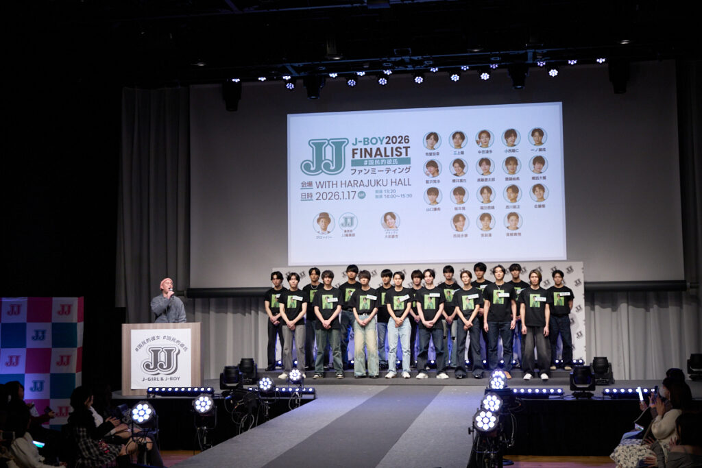 創刊50周年を迎えたファッションメディア『JJ』が主催するモデルオーディション「JJモデルオーディション2026」の「J-BOY #国民的彼氏」ファイナリスト18人によるファンミーティングが1月17日(土)東京・原宿のWITH HARAJUKU HALLにて開催されました! 会場はたくさんのファンが集合。J-BOYファイナリストたちが最終決戦に向けてアピール合戦を繰り広げました。