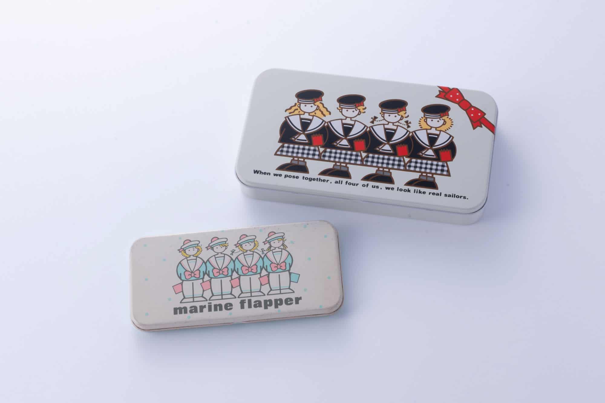 ゆかしなもん先生:これは秋冬っぽい感じのセーラー服がデザインされたカンペンケースです。当時のトレンドヘアスタイル「ソバージュ」の女の子もいますね。