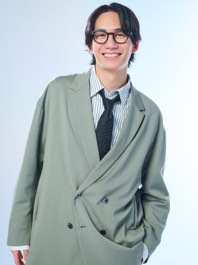 藍沢晃多: コンセプトの中でも、“違う色”を出すためにポージングや表情を変えることは想像以上に難しく、同時にそれがモデルの仕事なのだと実感しました。試行錯誤する時間も含めて、とても刺激的でおもしろい撮影でした。メガネや細かいアクセサリーを取り入れることで、王道からも少し外したスタイリングになり、今までの自分では出せなかった雰囲気を表現できたと思います。