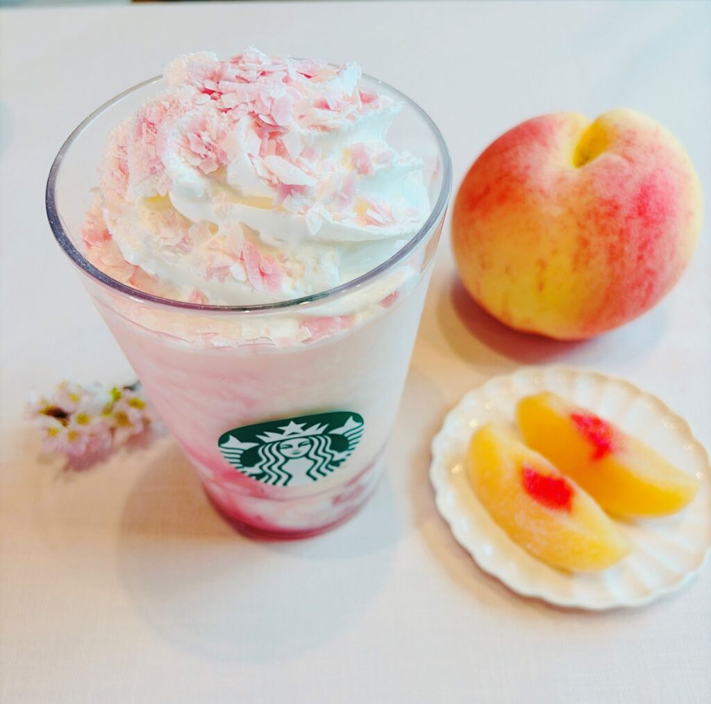 桜&白桃の絶妙なコラボを楽しめる「桜 咲くよ 白桃 フラペチーノ」。カップの底に潜むのは、ほんのり甘いミルクプリンとすっきりとした味わいの白桃ジュレ。桜の花や桜餅の香りがふんわりと広がるクリーミーなソースと、白桃パウダーを合わせ、ホイップクリームと2色の桜フレーバーシェイブをトッピングした一品です。ひと口飲むとまず飛び込んでくるのは、ぷるんとした食感のミルクプリン&白桃のジュレ! 飲み進めるうちに桜のソースが混ざり、白桃とやさしい桜の両方を味わうことができます。