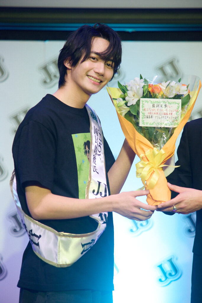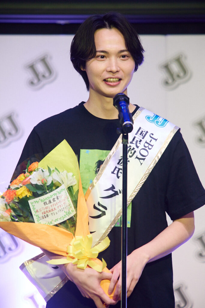 まずは、J-BOYグランプリの発表から行われ、最初に名前を呼ばれたのは牧屋宏幸。客席からは「やったー!」など、大きな歓声も。受賞者にはアンバサダーの沖からタスキと花束が授与されました。