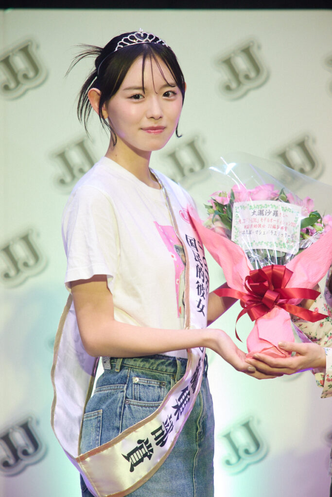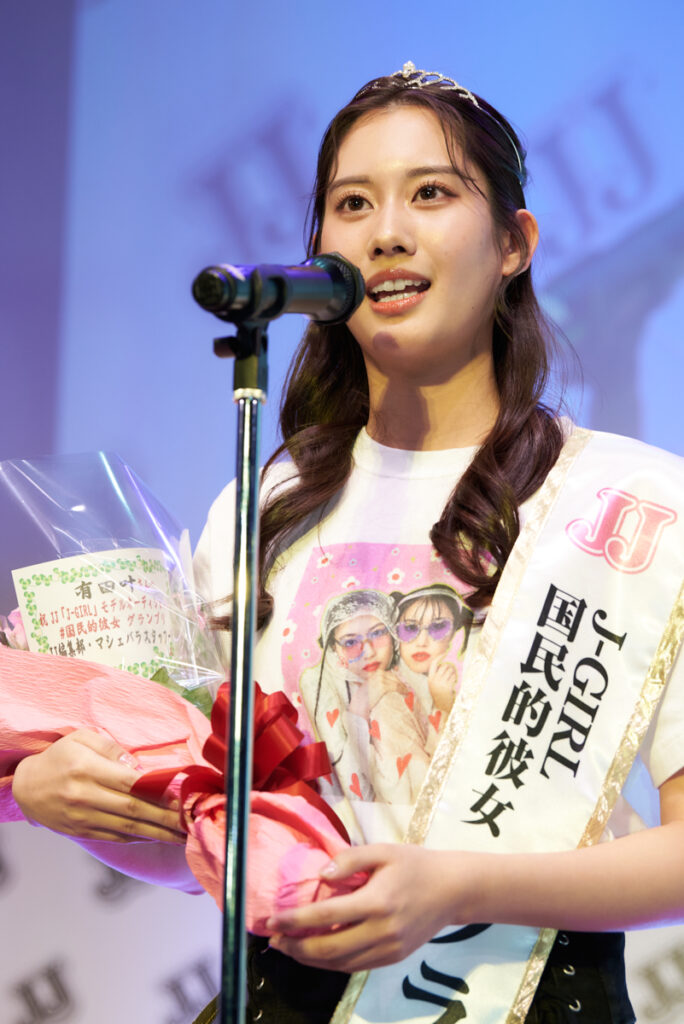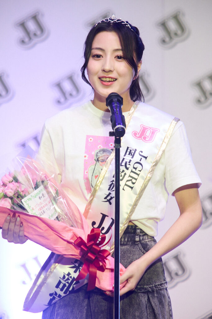 「私は第1回からこのオーディションを知っていました。いつか私もJ-GIRLになりたいと思い、これまでたくさんのオーディションやお仕事に挑戦して自信をつけてきました。今こうしてグランプリになれてこの景色をずっと見たかったこの景色を見られていることが本当に嬉しいです。ここまで応援してくださったファンの皆様には心から感謝しております。私と一緒に夢を叶えてくれてありがとうございます。JJ、J-GIRLにふさわしい女性になれるように、みんなに愛される素敵なモデルになれるように努力してまいります。そして、この1年間の活動を通して、応援してくださったすべての皆様に恩返しができるように毎日一つ一つを大切にしていきたいと思います。私はファンミーティングでJ-GIRLの先輩方に『私、絶対に後輩になります』と伝えました。こんなに強い言葉を使ったのは勇気がいることでしたが、みんながそれを本物に変えてくれました。本当にたくさんの応援をありがとうございました。J-GIRLの先輩方、これからどうぞよろしくお願いいたします」