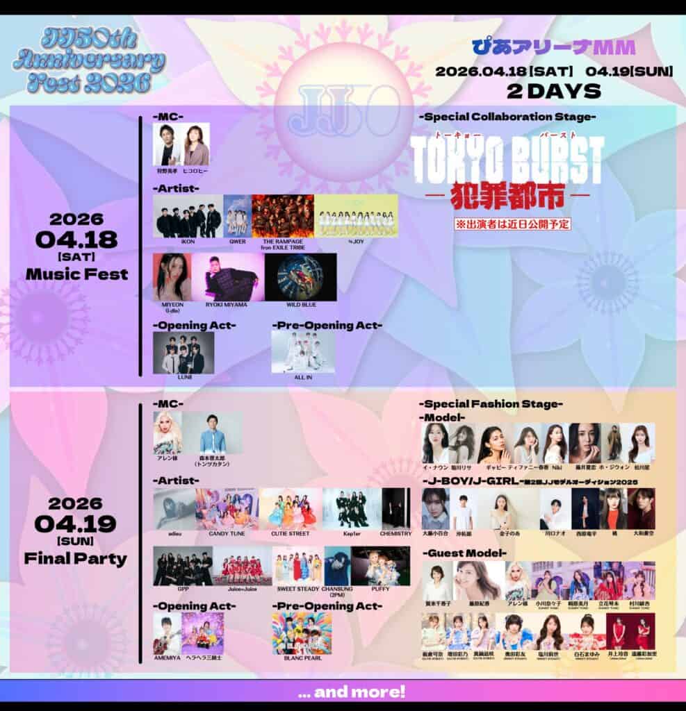 時代を超えて愛される歴代モデルと現在の専属モデルはもちろん、日韓の人気アーティストや多彩なスペシャルゲストも登場予定。また会場では、JJオフィシャルブースでの50周年記念グッズの販売をはじめ、ファッション、コスメ、グルメなど様々なパートナー企業によるスペシャルブースの出店も予定しております。「音楽が好き」「ファッションが好き」そんな想いを持つすべての人に向けたボーダレスな新しい体験をお届けします。