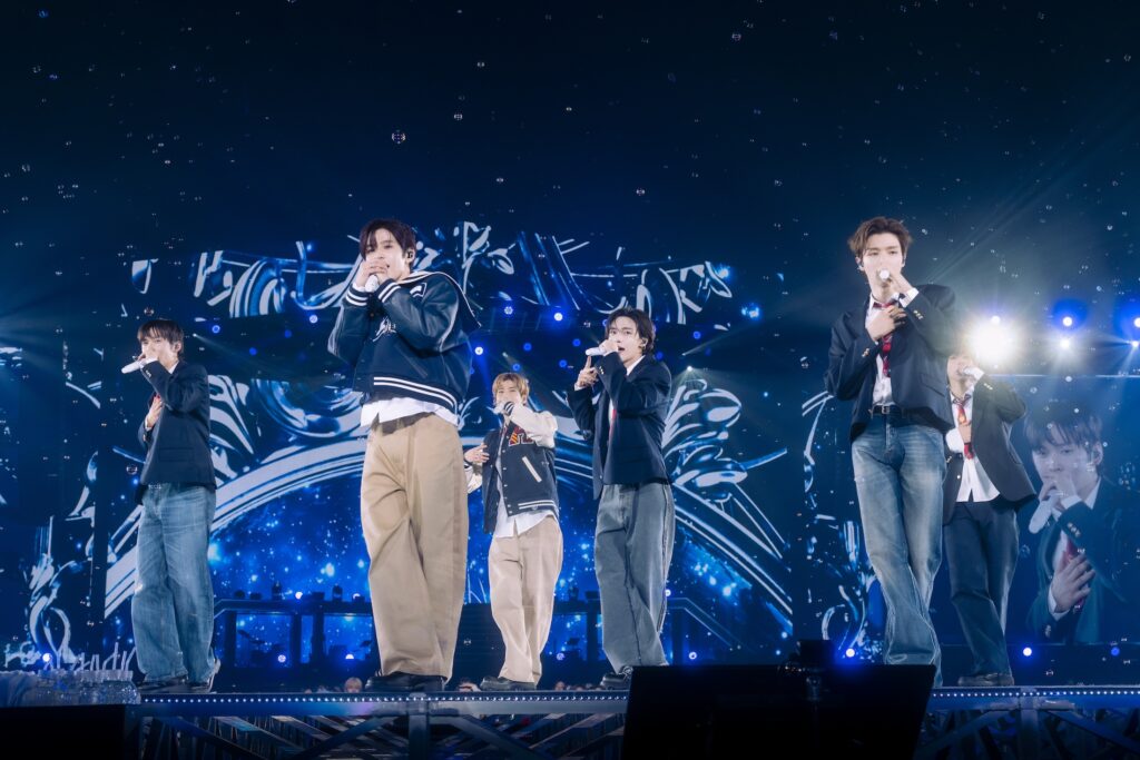 「Hug」では、SHOTAROとSOHEEがムービングステージに残り、WONBINとANTON、SUNGCHANとEUNSEOKはトロッコに乗って移動。メンバー1人ずつ胸元からBRIIZEへのメッセージを書いたノートを取り出します。SOHEEは「BRIIZE チョベリグ」、SHOTAROは「BRIIZE、好きすぎて滅」、ANTONが「BRIIZEの顔を記憶中」、SUNGCHANが「好きやで」、EUNSEOKが「BRIIZE 愛してるよ~」、WONBINが「夢を叶えてくれてありがとう☆」というメッセージでした。「Flashlight」で全員がメインステージに集合し、Mrs. GREEN APPLEのカバー楽曲「ライラック」を披露。BRIIZEも一緒に歌い、東京ドーム中がひとつになります。WONBINが「愛してる」という歌詞を歌ったあとに大きいハートを作り、ひと際大きな歓声が上がりました。