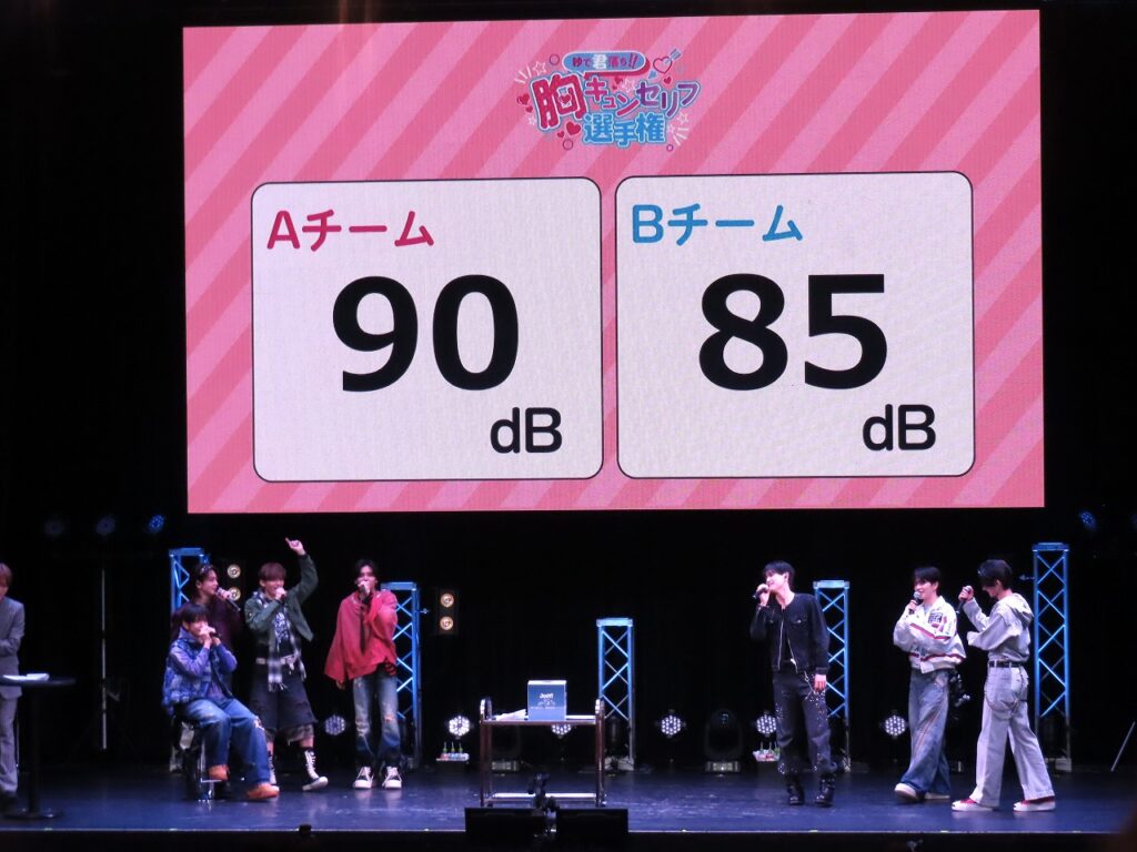 両者の甘すぎるセリフに悲鳴のような歓声が上がり、aoringたちをキュンキュンさせていました。そして会場の「キャー」の声を計測した結果90dBと85dBでAチームが勝利しました。
