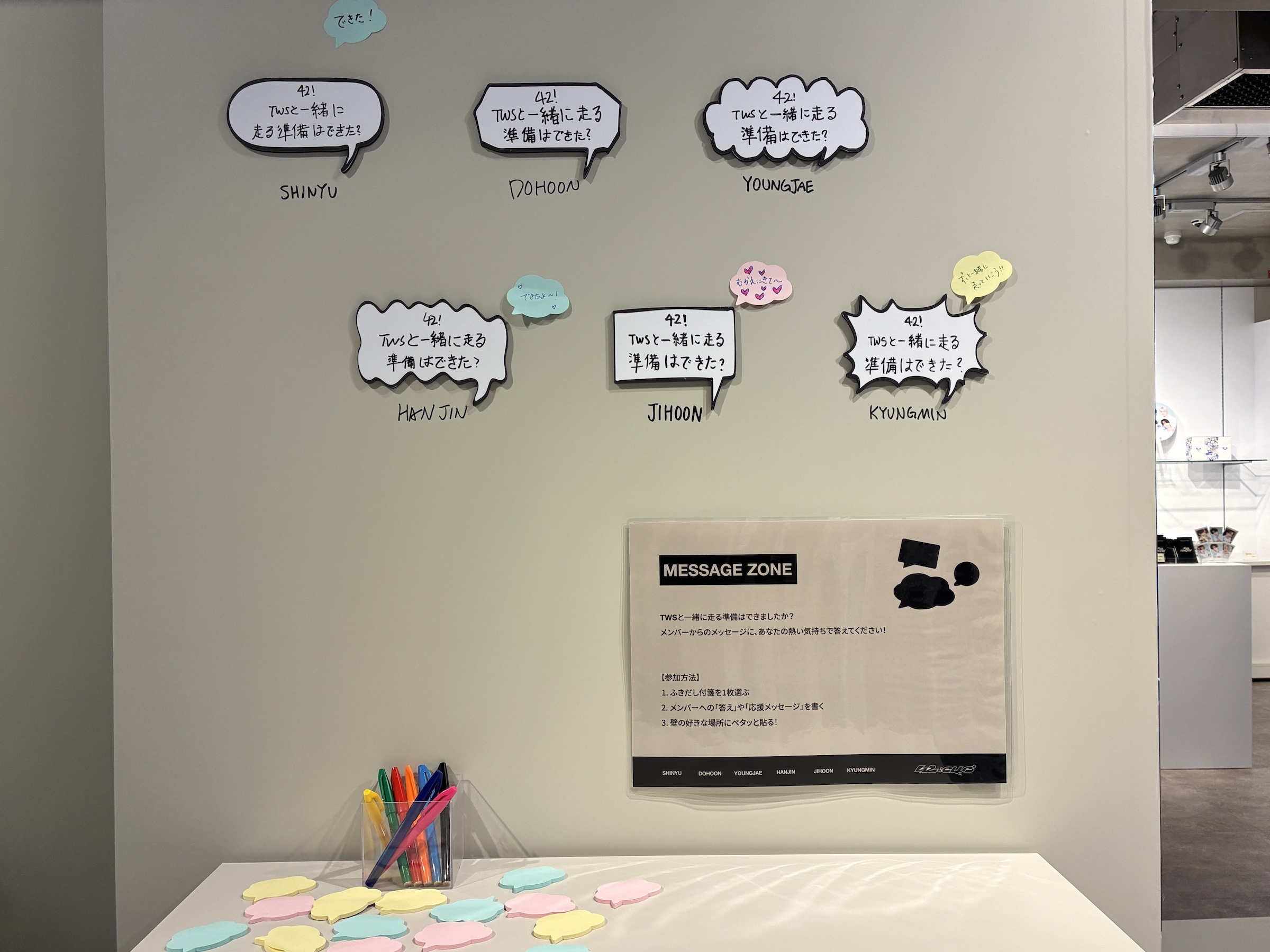 写真の反対側には、サッカーボールやラケットなどのアイテムを持ってTWSと一緒に写真を撮れるフォトスポットが! さらに、「42!と一緒に走る準備はできた?」という、各メンバーの手書きのメッセージボードが掲出されていて、その周りには来場者が好きなメッセージを貼れるようなスペースも♡ ファンミーティングの世界に吸い込まれていくような空間になっています。